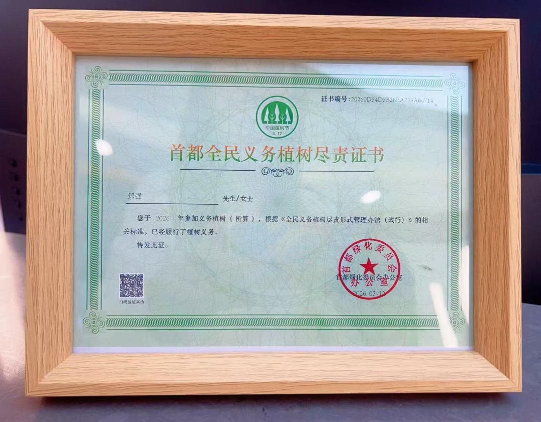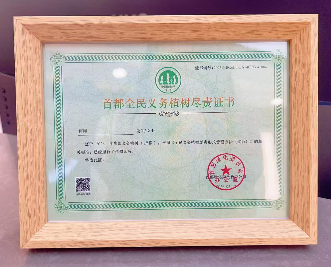 一份证书,一份认可;一次植树,一份担当。“首都全民义务植树尽责证书”的颁发,不仅是对个人公益行为的表彰,更是对金唐(北京)律师事务所积极履行社会责任、践行公益初心的高度肯定。