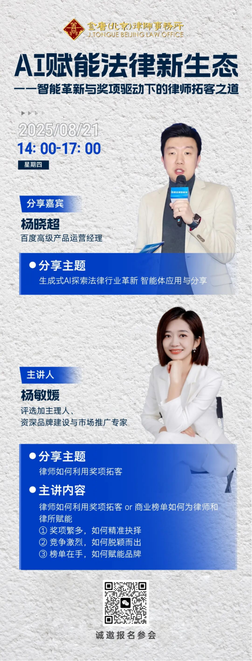 活动邀请 | 8月21日诚邀您参与“AI赋能法律新生态一一智能革新与奖项驱动下的律师拓客之道”专题讲座