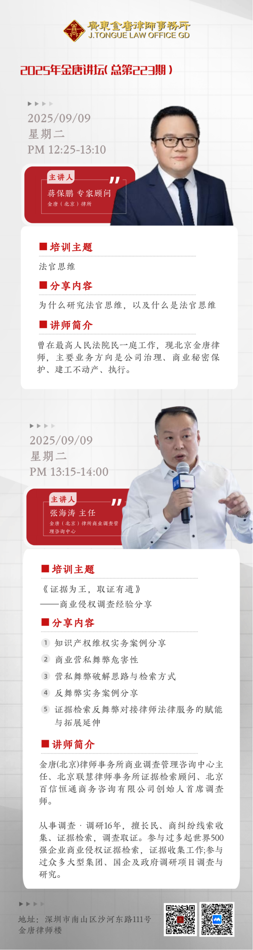 2025年9月9日,金唐律所成功举办了2025年第24期(总第223期)“金唐讲坛”。本次讲坛特邀最高人民法院原民一庭法官、现金唐北京律师事务所专家顾问蒋保鹏,金唐北京律师事务所商业调查管理咨询中心主任张海涛担主讲人,讲座分为上下半场,上半场蒋保鹏顾问就“为何研究法官思维及其应用”这一主题进行了深度分享,下半场张海涛主任主讲,系统性拆解了商业侵权调查、营私舞弊取证、婚姻家事证据收集及债务纠纷执行等核心领域的实战路径。